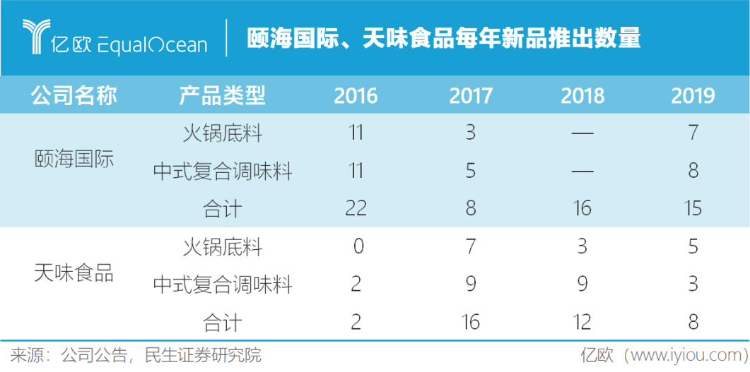 对比同属调味料行业上市公司的颐海国际和天味食品,在2016年至2019年新品推出的数量上,颐海国际是具有明显优势的。