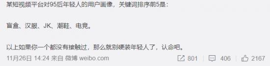 你知道现在的年轻人都在玩什么?近日,某短视频平台通过调研,得出了年轻人的用户画像,其中有5个关键字:盲盒、汉服、JK、潮鞋、电竞。