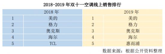 2018年与2019年“双11”空调线上销售,美的始终盘踞在首位,格力位居第二,奥克斯和海尔紧随其后。