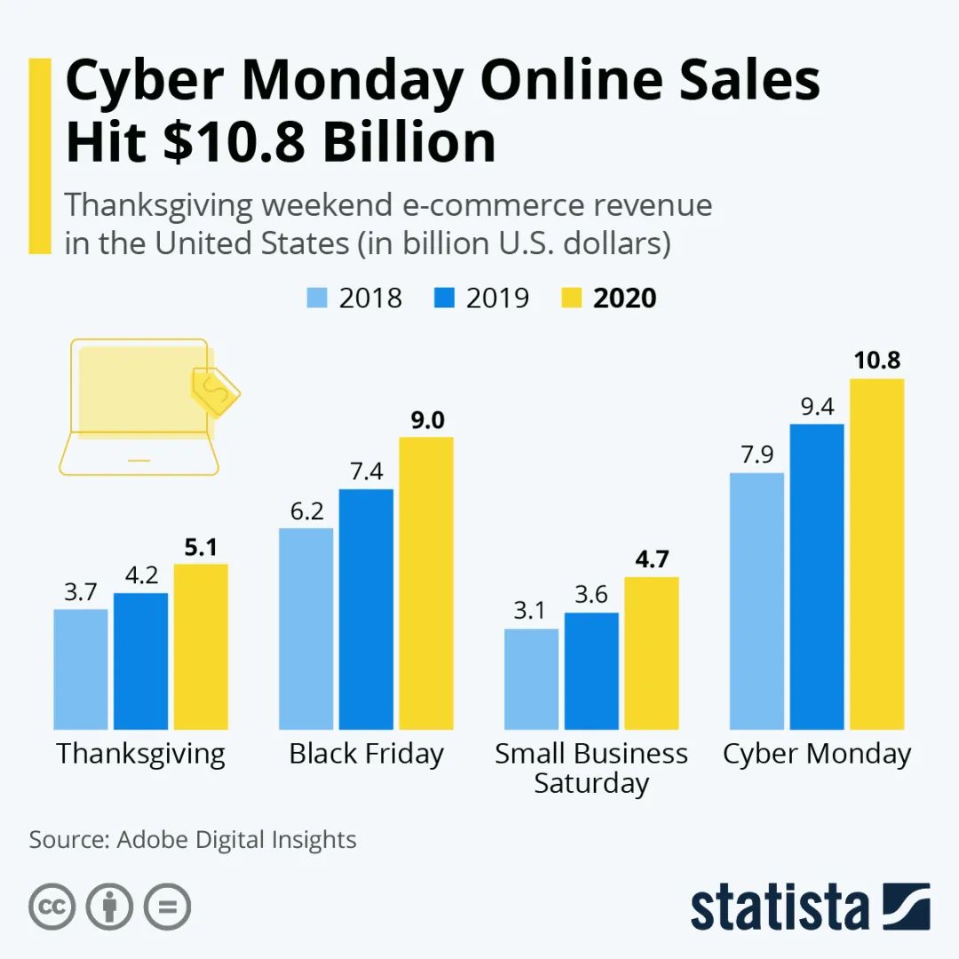 最好的例子莫过于今年黑五线上线下的表现与往年相比甚是不同,CNBC的数据显示,今年黑五线上销售额增长了21.6%,达到了90亿美元,而当天实体店的流量比往年减少了52%。Cyber Monday当天更是用108亿美元创下了全美历史上线上交易额最高的纪录,比去年增长了15.1%。