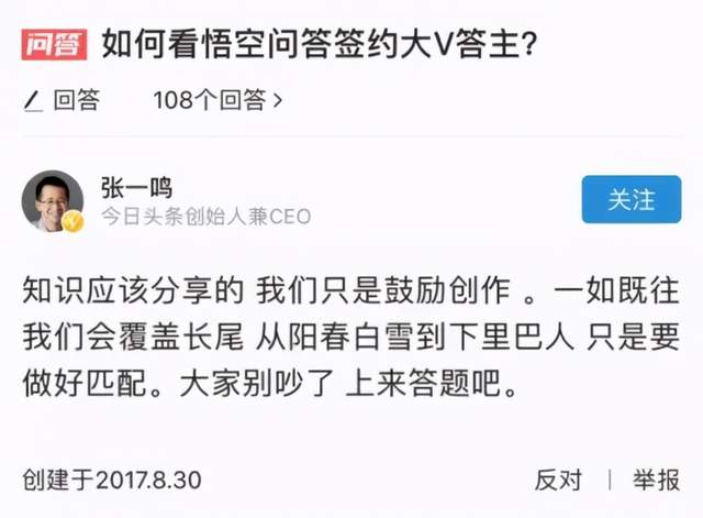 在悟空问答一口气签约超300个知乎大V的消息曝出后,知乎联合创始人张亮表示:“他以为中国就300个写作的人?”张一鸣回应,“觉得知乎创始人张亮对自己平台作者有点傲慢。”