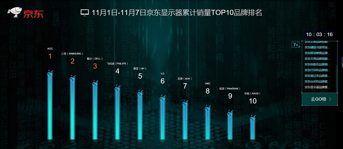 根据11月份的数据,看看目前的消费级显示器市场销量情况。目前看来,AOC还是以巨大优势领先,后续则是三星、戴尔、飞利浦和惠普等老牌厂商,可见消费者对这些品牌的认可。