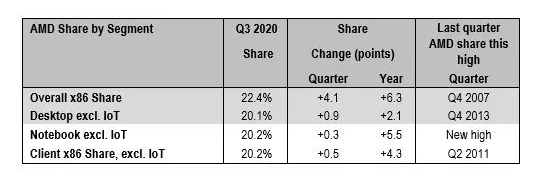 数据调研公司Mercury Research的报告显示,今年第三季度,AMD已经占据了 22.4%的x86处理器市场份额。其中,AMD台式机x86份额为20.1%,英特尔台式机x86份额正式跌下80%。考虑到英特尔的Rocket Lake还停留在14nm制程节点上,AMD有望趁热打铁,在明年占据25%以上的市场份额。