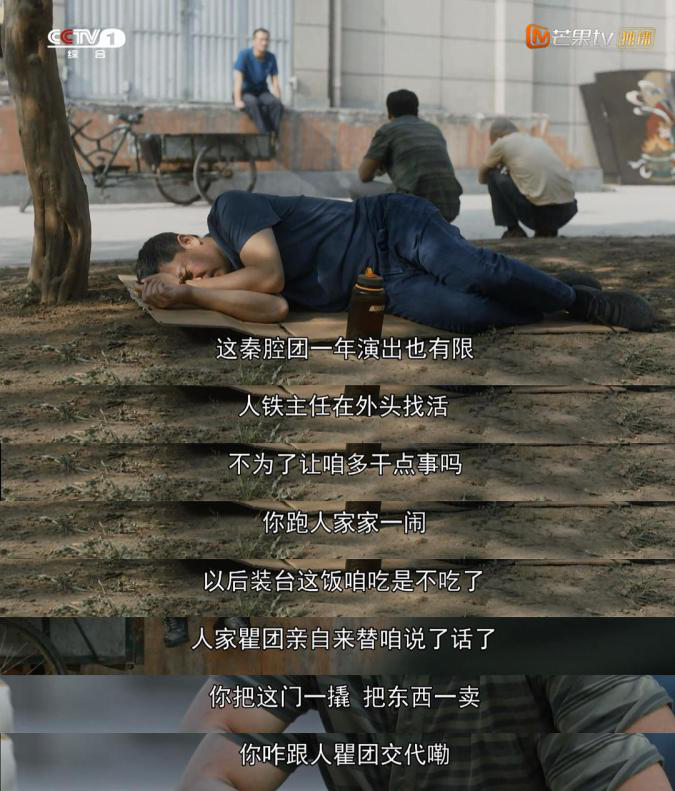 剧中没有高大全的人物构架,也没有绝对好或绝对坏的人物设置。这群靠力气挣钱吃饭的“装台人”最多的“花花肠子”,也仅是在被拖欠了工钱之后,在树荫底下蹲着发几句牢骚。即便,三两个没钱花的工人们,嘴上说要卖掉装台的物品补偿工钱,但看上去却更像是“激将”在纸壳子上歪着的“工头”刁顺子。