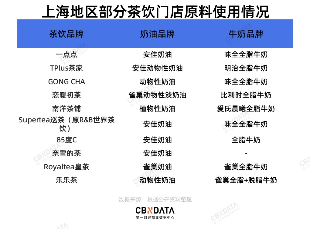 以上海地区的奶茶店为例,C站在搜集资料整理之后发现,明确透露原料品牌的奶茶店中,几乎是恒天然、味全,以及雀巢三者之间的排列组合。其中,恒天然安佳是上榜次数最多的品牌。