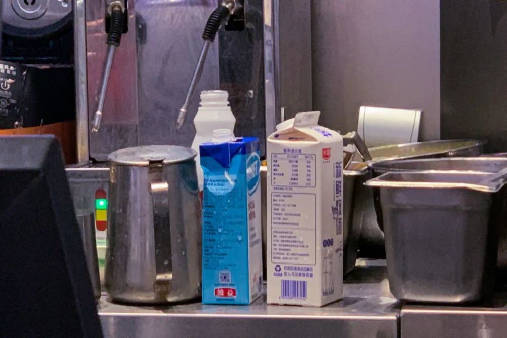 今天的奶茶店也开始流行在饮品制作台上摆放奶盒,但更多是为了表明该品牌采用的制茶原料足够新鲜安全——这已经是如今茶饮行业的通用做法。