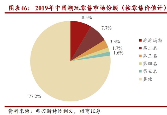 在玩法上,潮流玩具主要可以划分为手办、BJD娃娃和盲盒三种类型。尽管盲盒经济是一个潮流经济,但它在国内的发展渗透还不高。根据弗若斯特沙利文数据,2019年行业CR5为22.8%,其中泡泡玛特在国内潮玩市场占有率约8.5%,而其他的市占率为77.2%。