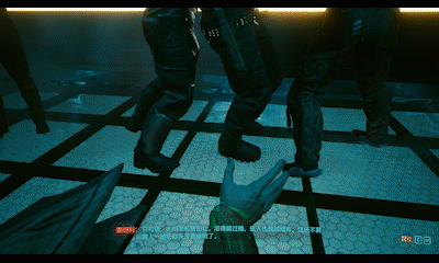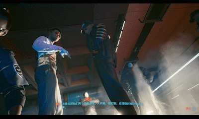 在“救人”任务中,我们在罪犯老巢里找到了目标人物。T指示V,通过链接的方式检测目标身体状况,V直接用手部的连接线接入目标脑接口,健康数据瞬间展示在脑海。