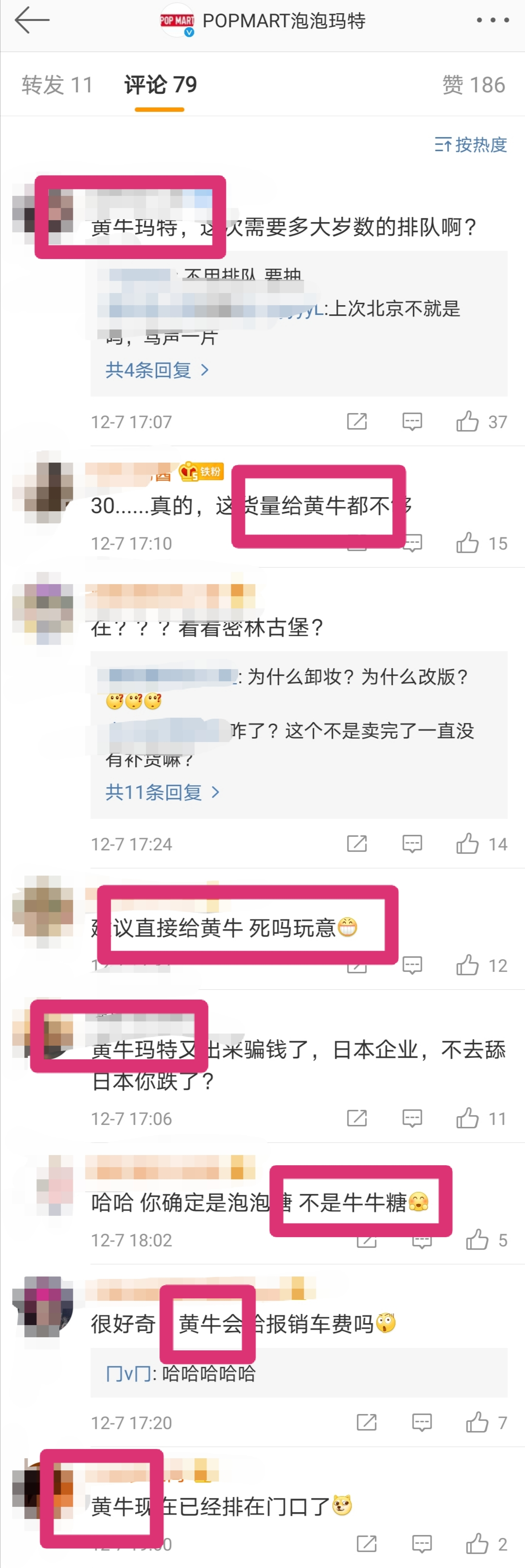 仅举一例,非盲盒类公仔小蜜蜂近期发布,仅限指定城市的线下店发售,每店30体,玩法是购物满129元可以参与抽奖,抽取购买资格,评论区骂声一片,在线下店普通玩家和黄牛比,完全没有竞争力。