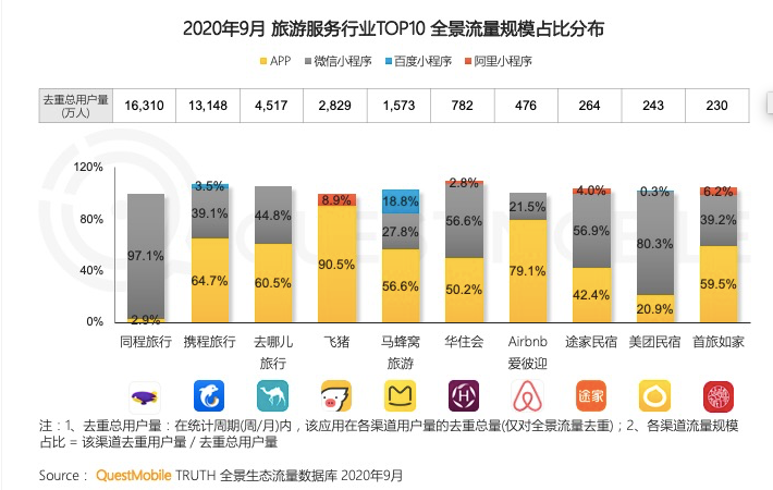 同程,去哪儿,携程共覆盖3.5亿人(未剔除重复人数),是当之无愧的行业头号选手,但在上图中也可以看到,在微信小程序帮助之下,以华住会,首旅如家为代表的供应商也在加大用户获取的力度,这可能都会摊薄携程未来的竞争力。