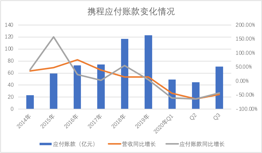 我们分析主要原因为:近年来美团和飞猪为代表的行业新参与者改变了行业的竞争态势,尤其美团,近年来借本地生活服务流量从低星酒店一直打到高星,一步步蚕食携程在线上出行领域中的核心优势,此外,航空公司也加大了机票直营业务,这样都使得携程需要在供应商处示好,以获得长久支持,压缩账期显然是常规手段之一。