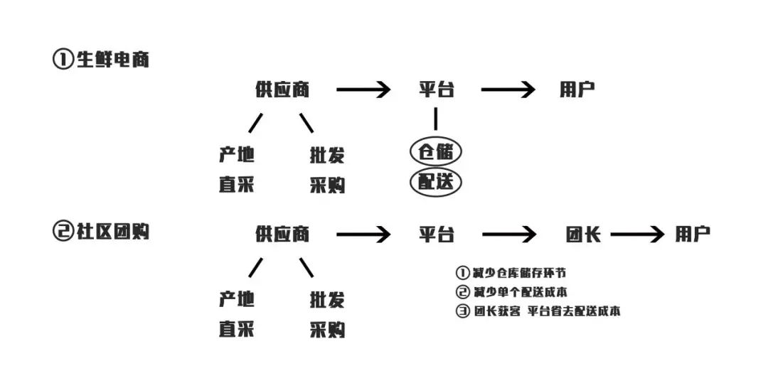 拆解两种模式可发现,跟生鲜电商相比,社区团购整个流程多了一道“团长”环节设置,以社区为单位,团长为零售终端,采取“预售+自提”。它的模式优越性在于,获客成本低,配送成本低,社区团长承担了前期获客与后期网点自提职能。