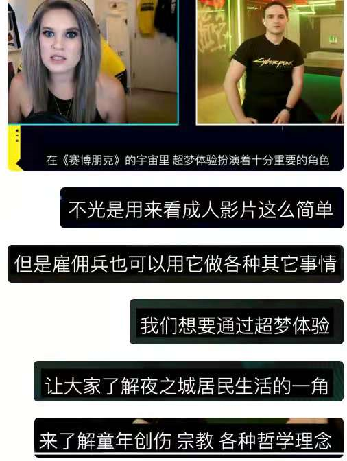 为了推广《赛博朋克2077》,CDPR一共推出了5期《火线夜之城》直播节目。如下所示,CDPR开发人员表示超梦是《赛博朋克》宇宙里面重要的存在,雇佣兵可以用它做各种其他事情,如了解夜之城居民生活的一角,或者了解各种宗教哲学理念等,这个消息也让很多玩家期待在实际游戏中收集超梦影片。