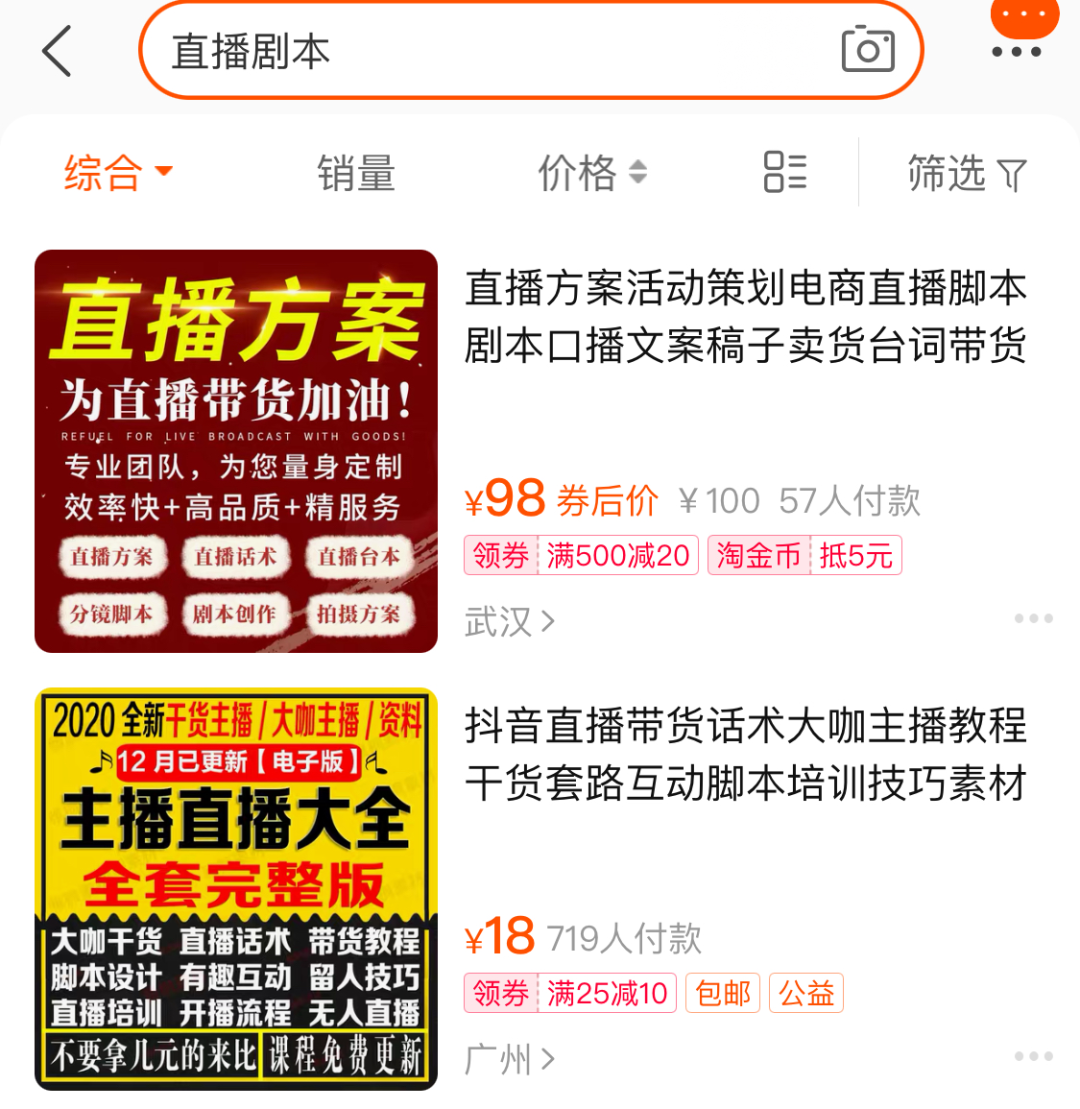 哪里有需求,哪里就有服务。网视互联(ID:wxs360)发现,在淘宝上搜索“直播剧本”,关于剧本订制服务的商家随处可见。
