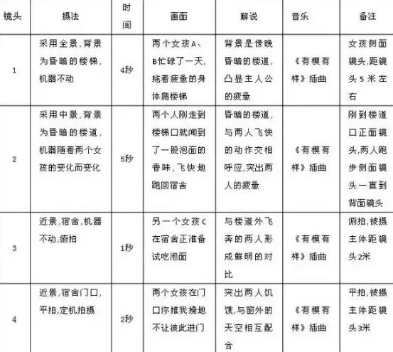 而短视频剧本就更完善了,甚至已经接近影视剧剧本,拍摄手法、画面、解说、音乐都非常详尽。