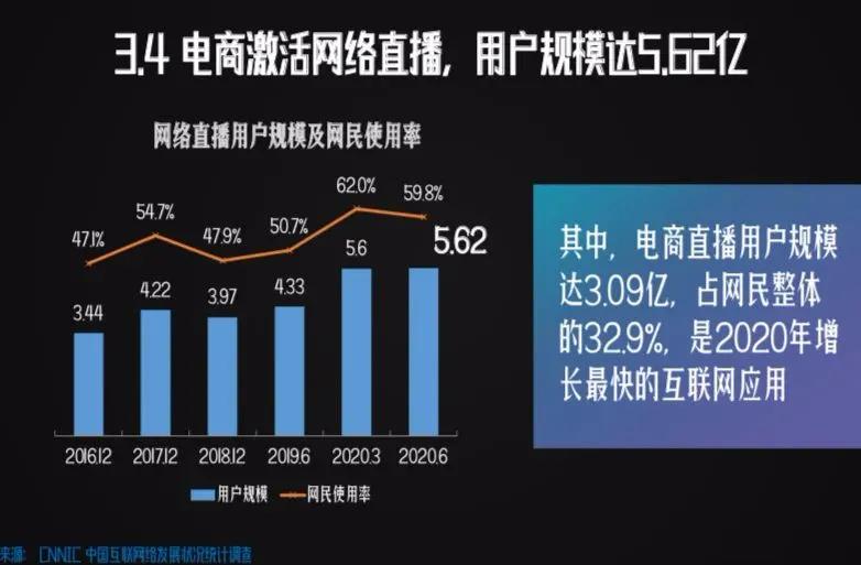 艾媒咨询曾在2019年底判断2020年在线直播行业用户规模将达5.26亿人,这是疫情之前的预测。而根据今年10月《2020中国网络视听发展研究报告》的数据,截至2020年6月,我国网络直播用户规模达5.62亿,短短半年已经大大超出此前的全年预期。