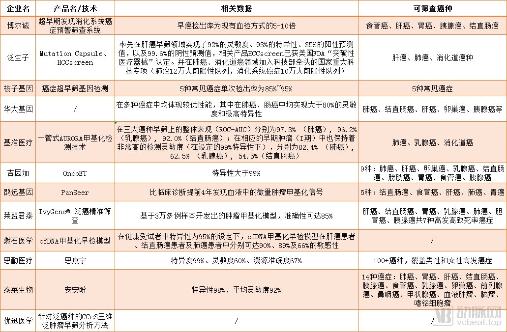 国内部分正在布局泛癌种早筛的企业(数据来源:动脉橙)