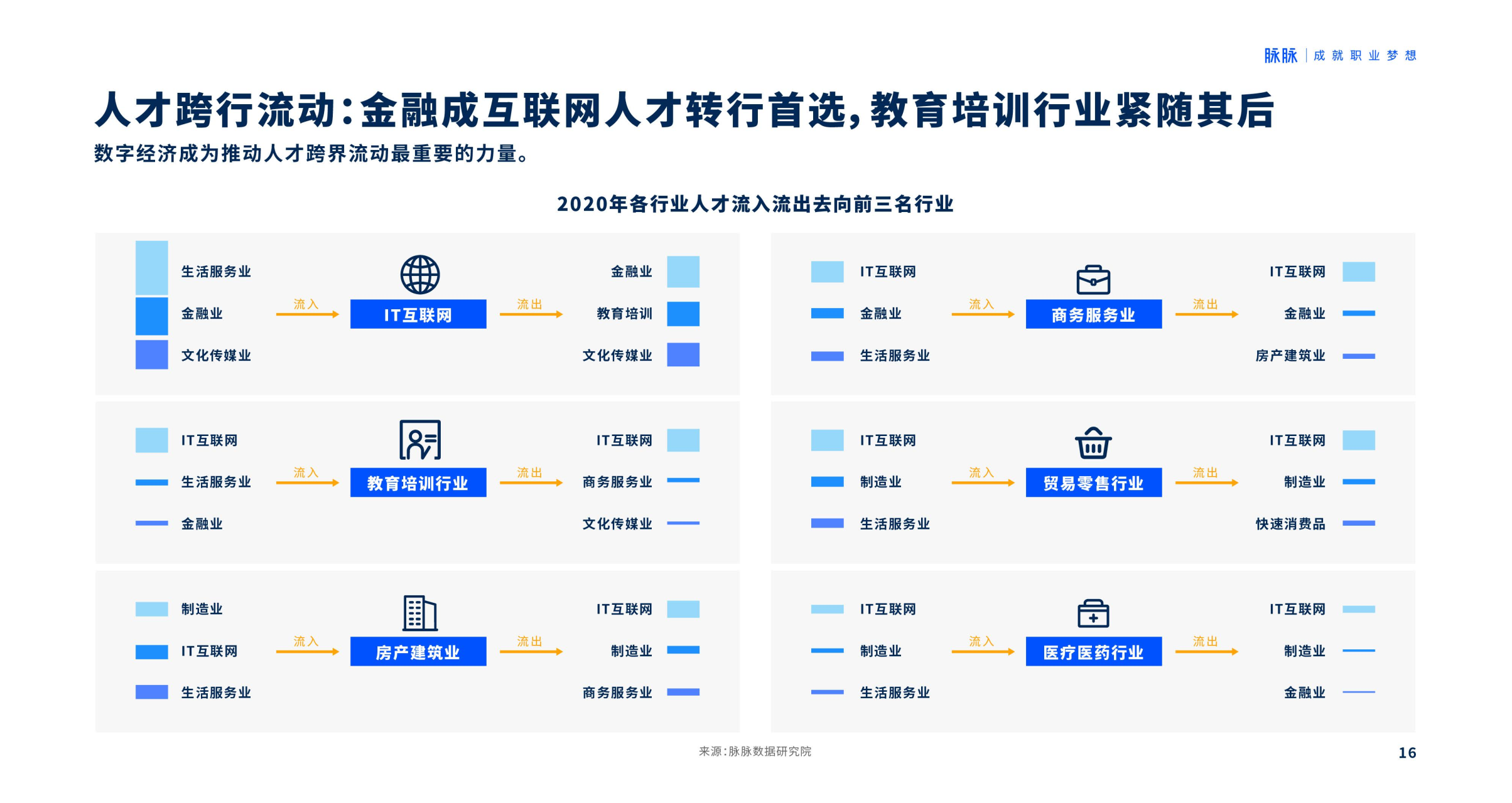 与此同时,数字经济成为推动人才跨界转行的重要力量:金融成互联网人转行首选,其次是教育培训与文化传媒行业。