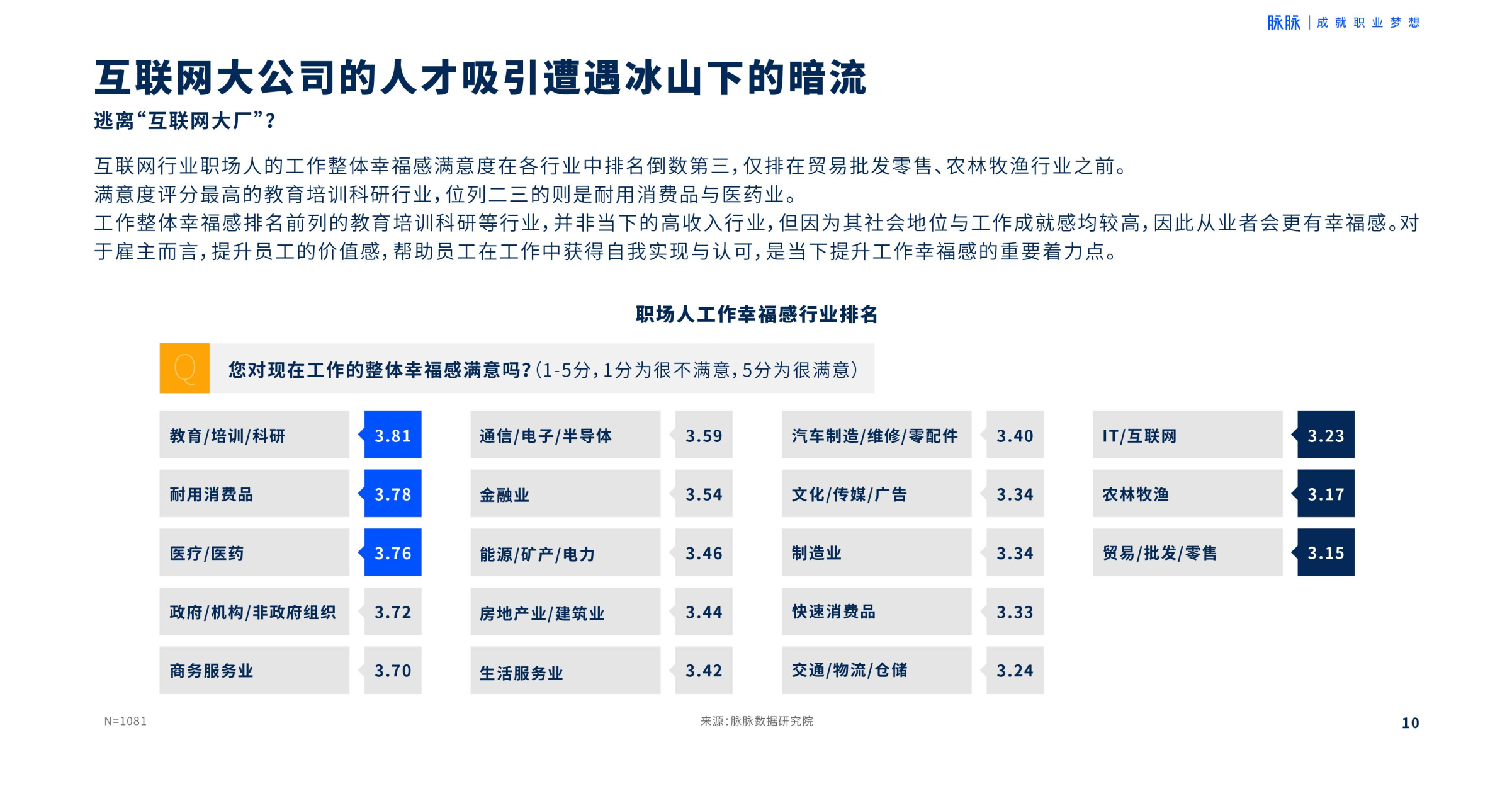报告显示,三大工作整体幸福感最高的行业:教育/培训/科研、耐用消费品、医疗/医药;