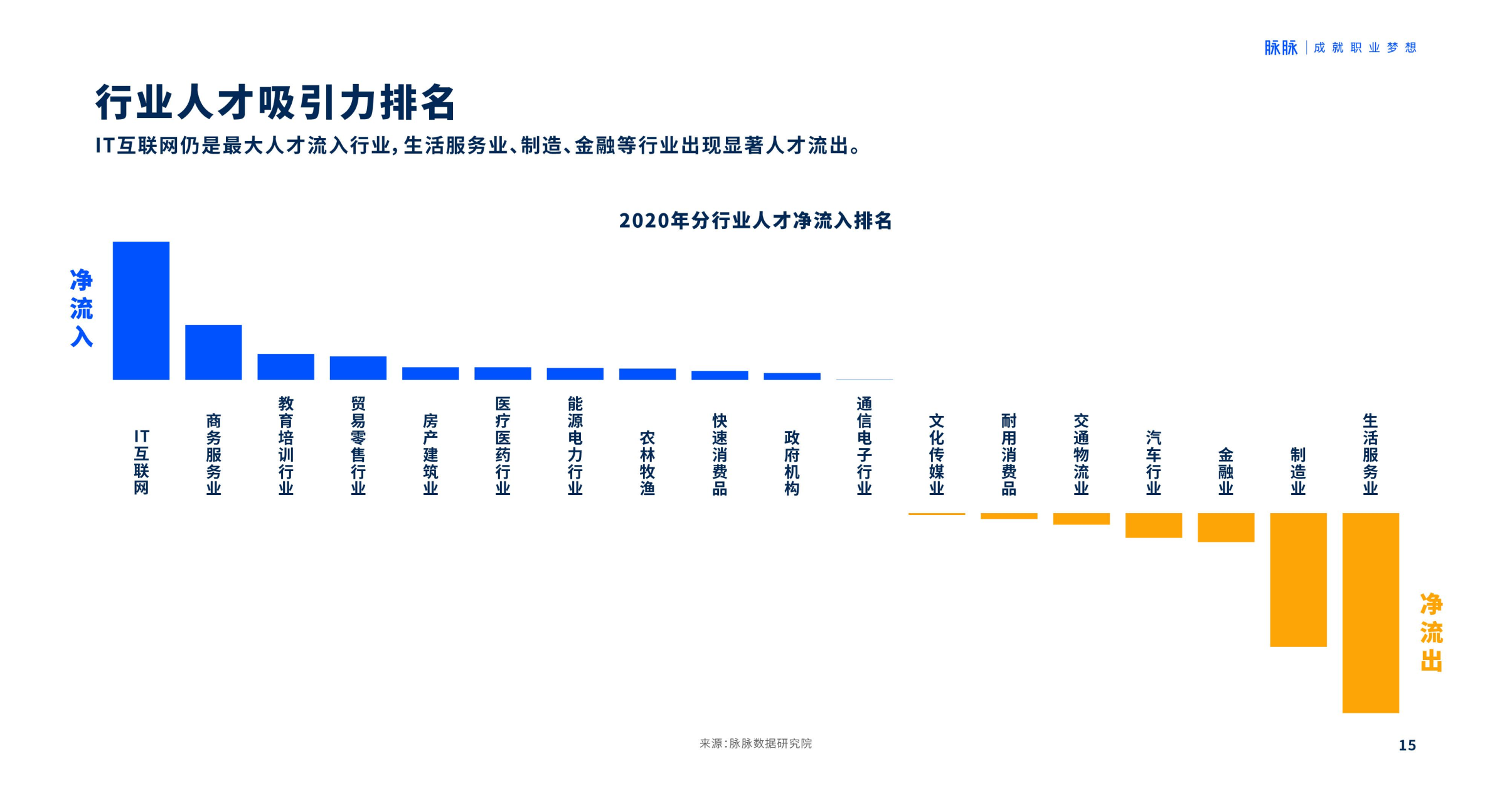 IT/互联网近年来一直是人口净流入最大的行业,生活服务业、金融业和文化传媒业大量人才流入IT/互联网行业。