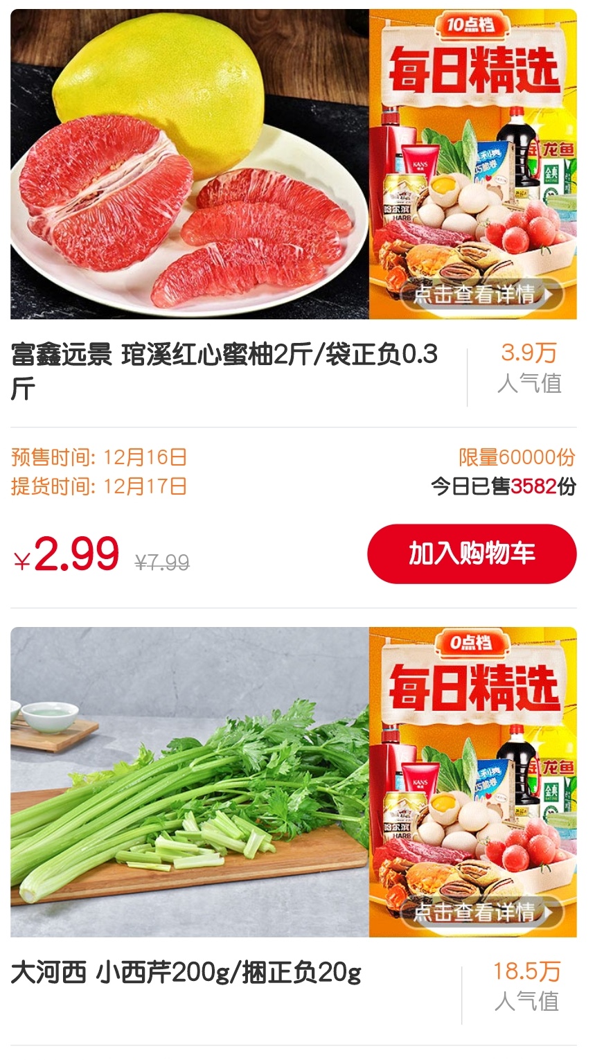 目前各个平台都开设了非常丰厚的新人特权:如1分钱的鸡蛋(4个),1分钱的盐(一袋)等等,新人注册购买就能享受。除此之外,高频率的超低价秒杀、各种明显低于市场价的产品更是数不胜数。巨额补贴的刺激之下,现阶段社区团购平台上同一商品的客单价,往往比传统商超便宜20%~50%。