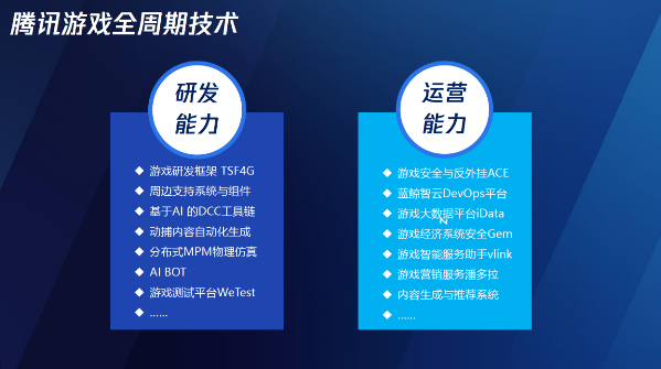 在运营侧,主要有安全防外挂、智能客服机器人等能力。比如蓝鲸平台,它是一个在持续集成和运维自动化等方面的重要平台,游戏厂商可以直接下载使用。