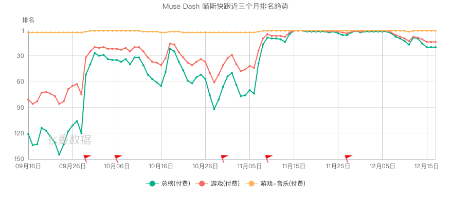 更重要的是,短视频的出圈发酵,直接促成了《MuseDash》这款游戏的销量“回春”——据PreoPeroGames官微于11月19日更新的博文数据显示:《MuseDash》已经在TapTap端冲破100万份销量,全平台冲破233万份销量。七麦数据显示,自11月15日以来,该款游戏一跃成为付费游戏榜首,这款于2018年多平台上线的音乐手游,堪称“最大赢家”。
