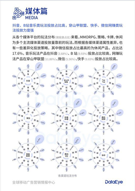音乐类手游也更愿意在抖音平台买量。根据DataEye-ADX手游买量11月报:抖音、B站音乐类玩法投放占比高。