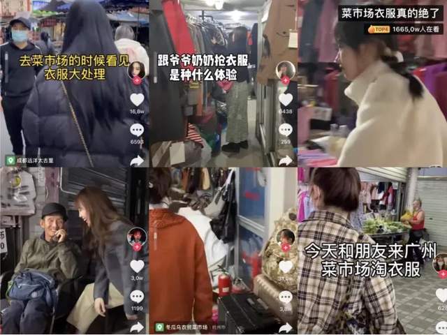在抖音,单#菜市场衣服真的绝了#这一话题词条下的视频播放量就已达到6.4亿次,“用100块钱淘十多件衣服”“29块钱穿出高定感”的攻略或教程也层出不穷。