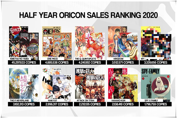 从漫画原作推出,到动漫番剧上线,再到剧场版上映,所向披靡的《鬼灭之刃》创造着一个又一个纪录:据Oricon榜统计,2019年,外号“鳄鱼老师”的年轻女漫画家吾峠呼世晴创作的《鬼灭之刃》漫画总销量达到9994120册,登顶年度冠军,打破第二名《海贼王》漫画销量13连冠的纪录。2020年半年榜也继续霸住榜首甩开第二名10倍,其累计销量已经破1亿2000万册(包括电子版)。累计发行量破亿的漫画只有《龙珠》《火影忍者》《海贼王》《灌篮高手》等9部“民工漫”,这意味着《鬼灭》已进入这一行列。