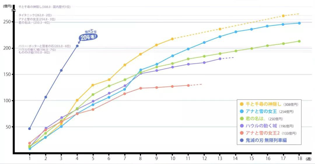 这个消息无疑也给了《千与千寻》一些压力:东宝近日宣布,将宫崎骏导演的动画电影《千与千寻》的累计票房从之前的308亿日元,向上修正为316.8亿日元,增加的8.8亿日元是今年6-8月日本重映票房。但无论如何,随着 MX4D 版与 4DX 版日本12月26日上映,《鬼灭之刃》登顶日本影史冠军已经势不可挡。动漫市场已经许久未见这样引发“鬼灭效应”的现象级大作,它带来了哪些启示?