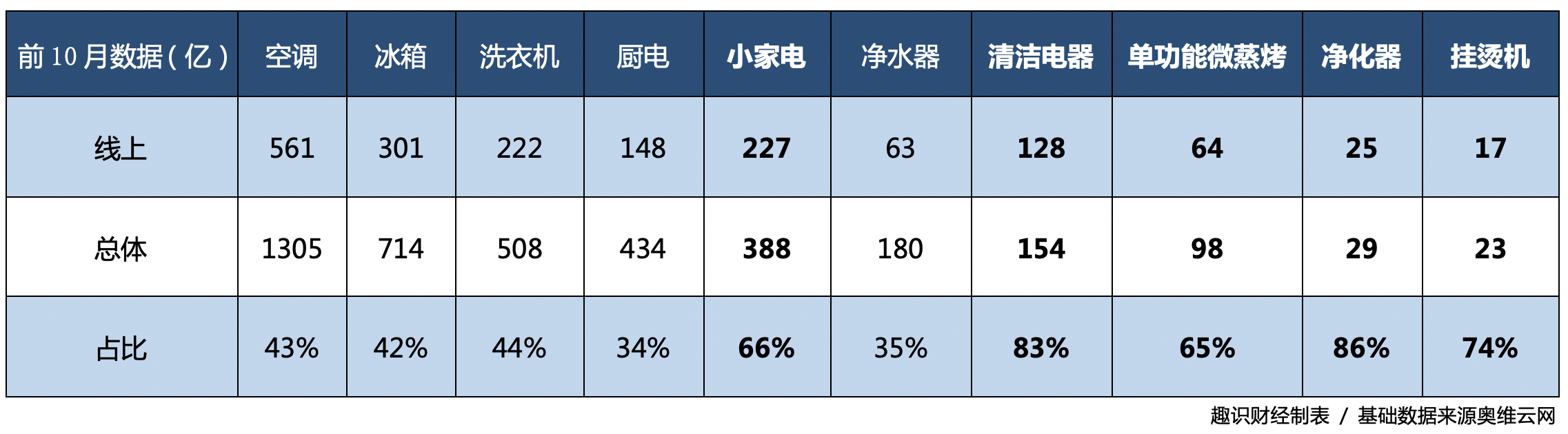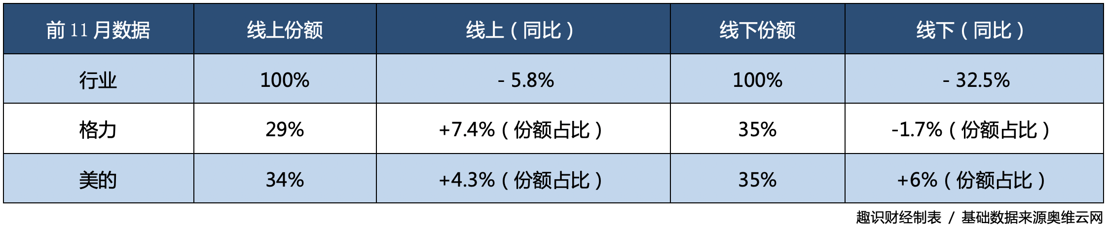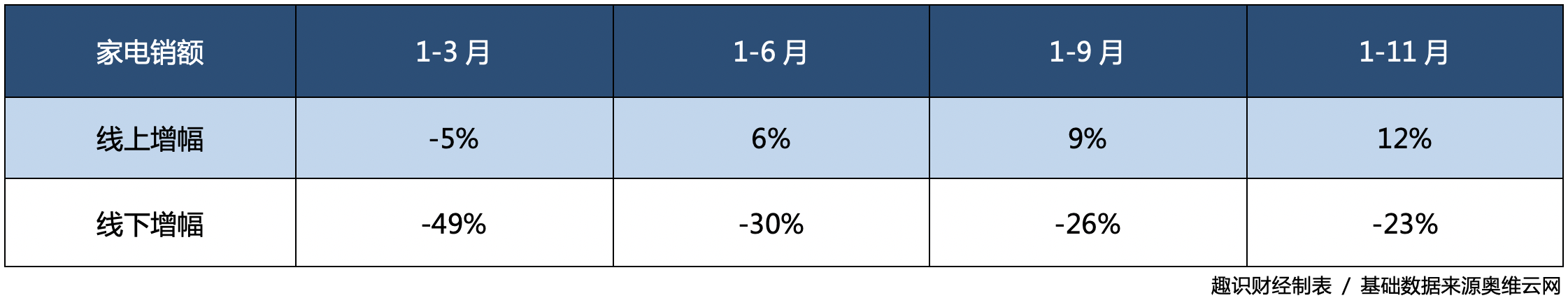 根据奥维云网数据,2020年前11月,整个家电行业线上销额同比上升12.46%,线下销额同比下降22.89%。