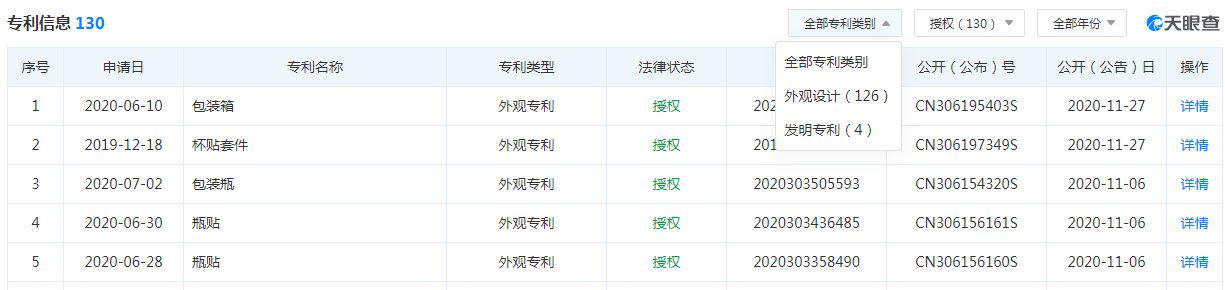 “小甜水”在产品上的门槛并不高,这也是为何后来者容易快速进入的原因。《商业数据派》通过天眼查查询其公司旗下相关专利,目前共有130个专利专利,其中126个都是包装箱、包装瓶、杯贴套件等外观专利;已授权的发明专利只有4种,分别是一种无糖的胶原蛋白饮料、一种无糖乌龙茶饮料及其加工方法、一种红枣红茶的制作工艺、一种带有枣香味的红茶制作工艺。