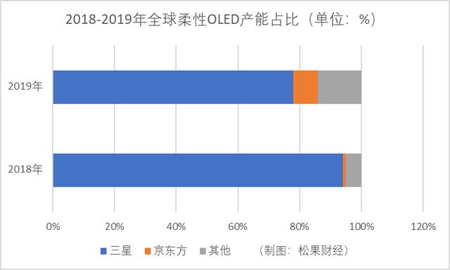 虽然市场广阔,但在柔性屏幕行业,大部分的市场份额已经被头部企业所占据。按照前瞻产业研究院所统计的数据,截至2019年,韩国三星已经占据了全球近80%的市场份额,牢牢掌握住了整个柔性屏的市场。不仅如此,三星还拥有覆盖全部业务的全套垂直整合供应链,从技术到供应链上都有着显著的优势。