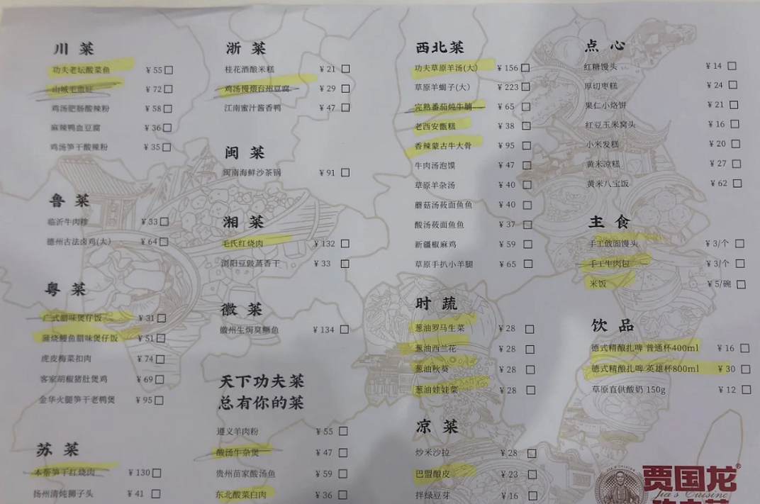 贾国龙功夫菜菜单 来源:网络
