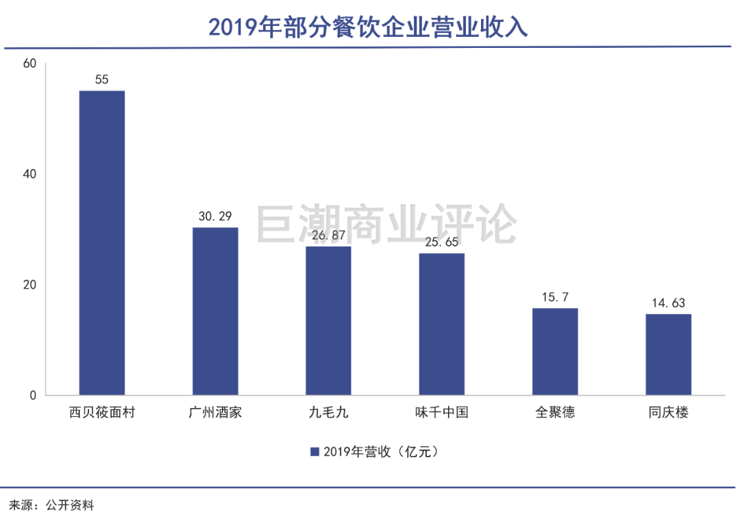 2019年,餐饮市场突破4.6万亿元,体量庞大,增速稳健,但行业高度分散,排名前三的海底捞、西贝、外婆家加起来,市场规模也没有超过0.5%,诞生巨头的空间很大。