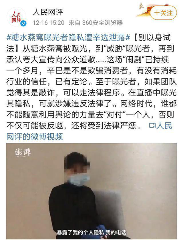 16日,人民网评再次发文“别以身试法”,剑指辛巴及其团队泄露糖水燕窝曝光者隐私。内容主要分为两个层面:其一,糖水燕窝闹剧至今,辛巴是不是欺骗消费者,有没有消耗行业信任,已有定论;其二,在直播中曝光他人隐私,涉嫌违反法律,网络时代谁都不能随意利用舆论的力量去“对付”一个人。