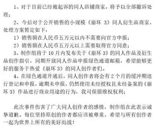 2020年9月份,米哈游就起诉同人事件向粉丝致歉,《刺客伍六七》因为起诉某同人画手引起粉丝不满而无奈撤诉;腾讯动漫禁止《一人之下》同人盈利,无数粉丝为创作者抱屈。