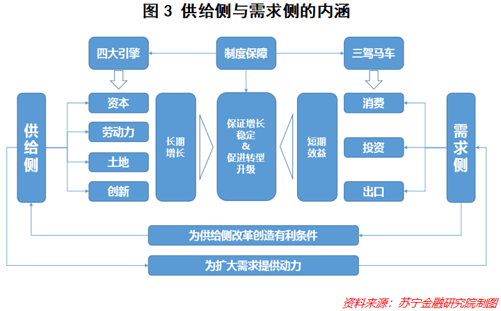 从经济学角度看,需求侧是指代拉动经济增长的“三驾马车”,包括消费、投资和出口,在扩大内需、形成强大国内市场的过程中,消费和投资的作用正变得越来越重要;至于供给侧,主要涉及到四大生产要素——资本、劳动力、土地和创新,其中资本、劳动力和土地侧重于生产要素投入“量的增加”,而创新则侧重于生产效率“质的提升”,关乎到技术进步、人力资本提升、生产组织方式改善等等(见图3)。