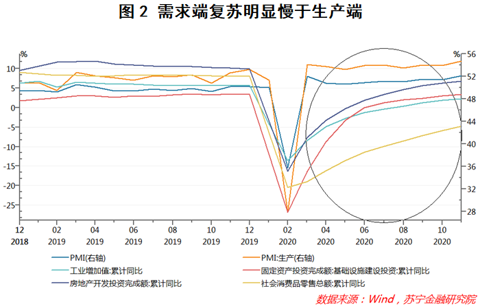 然而从另一个层面看,我国需求侧尚且存在一定的结构性问题,最典型的便是近些年地产、基建等领域的投资需求持续强势,但居民消费需求却相对偏弱,特别是经历了新冠疫情冲击之后,我国需求侧的结构性问题被进一步放大,不仅需求端的整体回暖进程要明显慢于生产端,而且居民消费需求的复苏进度也要明显滞后于房地产投资和基建投资需求;从数据上看,房地产投资与基建投资分别于6月份和7月份实现了累计同比的由负转正,但社零累计同比直到11月份还没能回到疫情之前的常态化水平(见图2)。