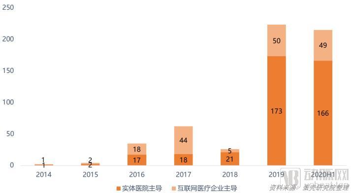 从动脉网目前为止的统计数据上看,2020年的互联网医院建设热度继续攀升,上半年就有215家互联网医院注册成立,几乎与2019年全年持平。同时互联网医院的建设工作也已经完成了从企业主导向实体医院主导的转变。在2019-2020年上半年注册成立的438家互联网医院中,有339家由实体医院主导建立,占比达到77.4%。越来越多的实体医院选择接入线上,通过互联网医院的方式向更多患者提供服务。