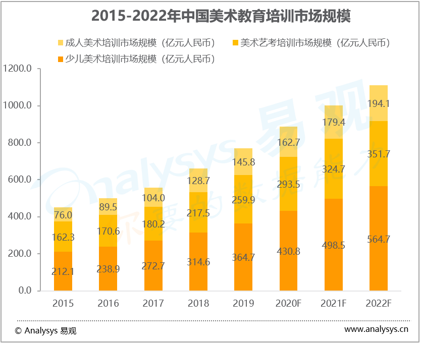 易观数据显示,我国美术培训市场规模从2015年的450.4亿元提升至2019年的770.4亿元,年均复合增速14.36%。