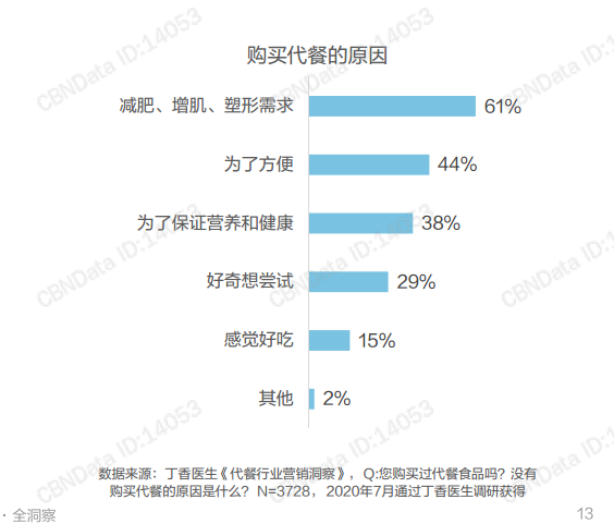 根据丁香医生数据显示,随着代餐消费日常化,线上代餐消费者中,新客及购买频次增加的老客占比超过75%,而30天内复购的人数占比最高,代餐消费正在日常化。其中,近70%的代餐消费者为女性,85后和90后消费者贡献了40%的消费,新崛起的Z世代潜力不容忽视。而购买代餐有61%的消费者是为了减肥,增肌,塑形。