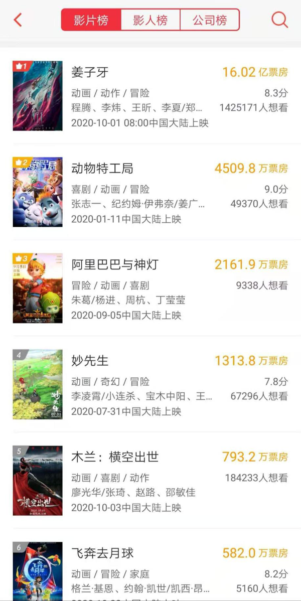 根据猫眼专业版票房统计的结果显示,2020年国产动漫院线电影共18部(其中两部将在12月底上映),累计票房共17.15亿,与去年相比,票房缩水了近75%。18部电影中《姜子牙》的票房为16.02亿,占据全年国漫电影总票房的95%。