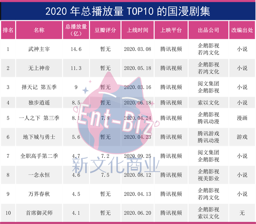 笔者整理了今年全网播放量前十的国漫作品(见下图),基本都出自腾讯视频,但许多动漫因集数过多可能会造成播放量虚高的情况,如排名第一的《武神主宰》总播放量为14.6亿,目前更新至84集,平均下来每集的播放量仅为1700万左右;相比而言《一人之下第三季》只有8集,但总播放量就达到8.1亿,才算真正的火热。但与前两季8.8、9.1的豆瓣评分相比,第三季的评分仅为7.8分,在口碑上有所下滑。