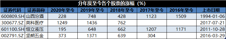 跟大家印象里不太一样的是,十倍股,真的是太稀缺了。从2016年至今,都快5年了,满打满算只有4只10倍股,其中从2016年至今,山西汾酒和恒立液压涨幅超过10倍,从2019年至今,又出现了2只10倍股,英科医疗和坚朗五金,严格意义上,今年的10倍股只有一只,那就是英科医疗。