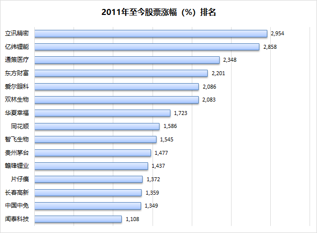 如果我们把时间拉长,剔除那些2011年以后才上市的股票,在总共1993只股票中,过去十年十倍的股票,也只有15只,这其中涨幅最大的是立讯精密,接近30倍,这就是为什么我们说,立讯精密是公募的信仰。