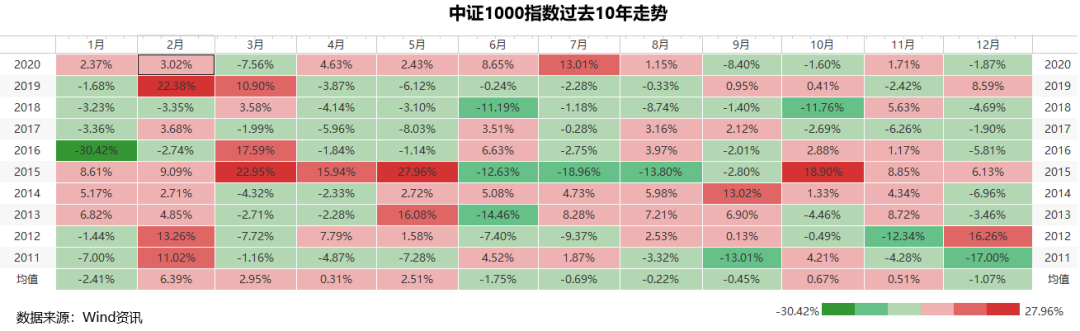 分月度看,在二月份,中证1000指数在过去10年里,有8年是上涨的,哪怕是下跌的那两年,跌幅也不大。真是二月不做多,一年活白干。