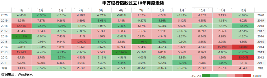 上图是申万银行指数过去10年的分月度涨跌幅。我们不好解释为什么,可在过去10年,10月份有9次是上涨的,肯定是在这个月份发生了什么,银行才会涨的吧。