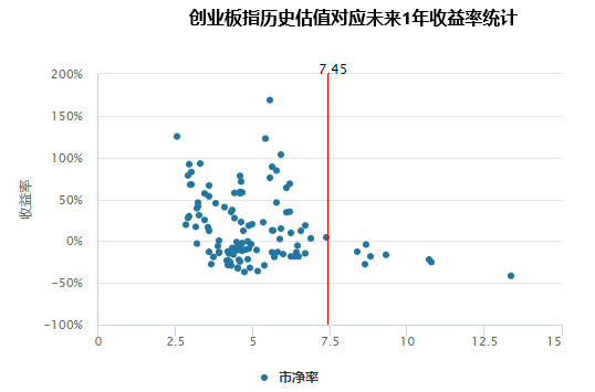上图是创业板指当前的历史估值对应的未来一年收益率统计。从市净率的角度看,当前创业板指估值已经非常高,历史上超过这个估值的月份寥寥无几。创业板市净率的下限在2.5左右,当创业板指市净率低到3左右时,未来一年盈利的概率非常大。至于现在,未来一年赚钱的概率相当小吧。想在创业板买到好股票,这个先验概率,确实不太大。